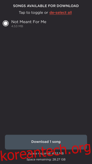 Jukebox를 설치하고 Dropbox 계정과 연동시키면(기기에 Dropbox 앱이 설치되어 있어야 함), Jukebox는 계정 내의 모든 오디오 파일을 자동으로 검색합니다. 검색이 완료되면 오프라인에서 들을 수 있도록 다운로드할 파일을 선택하라는 메시지가 표시됩니다.