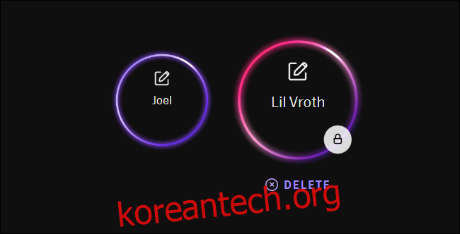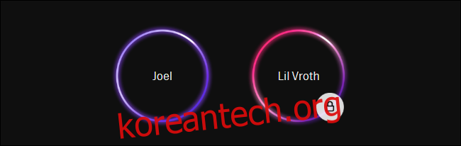 프로필 원의 오른쪽 하단에 자물쇠 아이콘이 표시되어 있다면 해당 프로필이 하위 프로필임을 알 수 있습니다. 자물쇠가 닫혀 있는 경우, 자녀 계정으로 전환하려면 PIN을 입력해야 합니다.