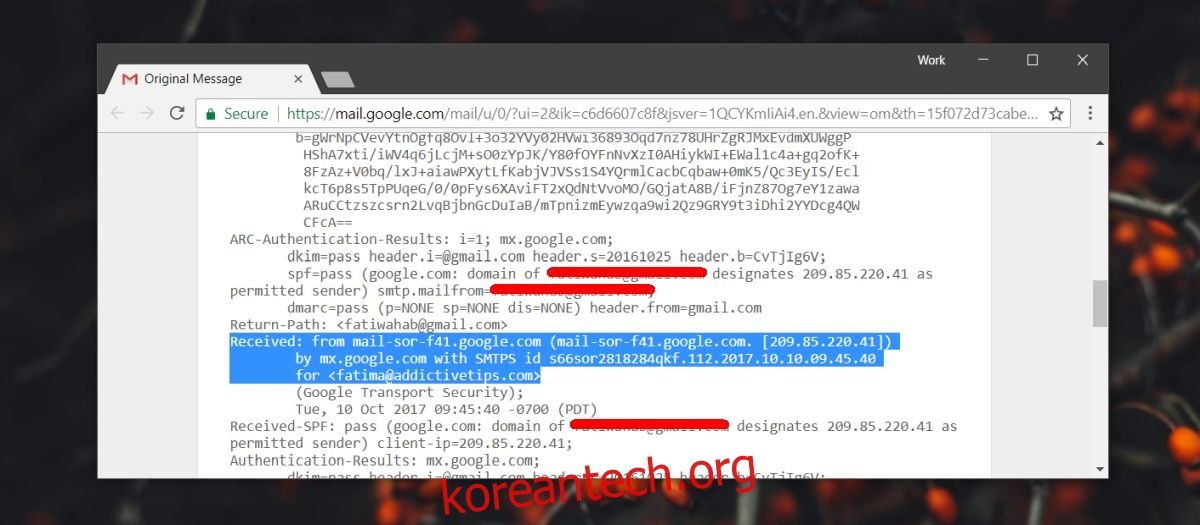 일반적인 이메일의 경우 ‘Received: From’ 필드는 한 번만 나타납니다. 그러나 전달된 이메일의 경우 여러 개의 ‘Received: From’ 항목이 표시될 수 있습니다. 스팸이나 피싱 메시지의 경우 발신자의 IP 주소를 찾는 것이 조금 더 복잡해집니다.