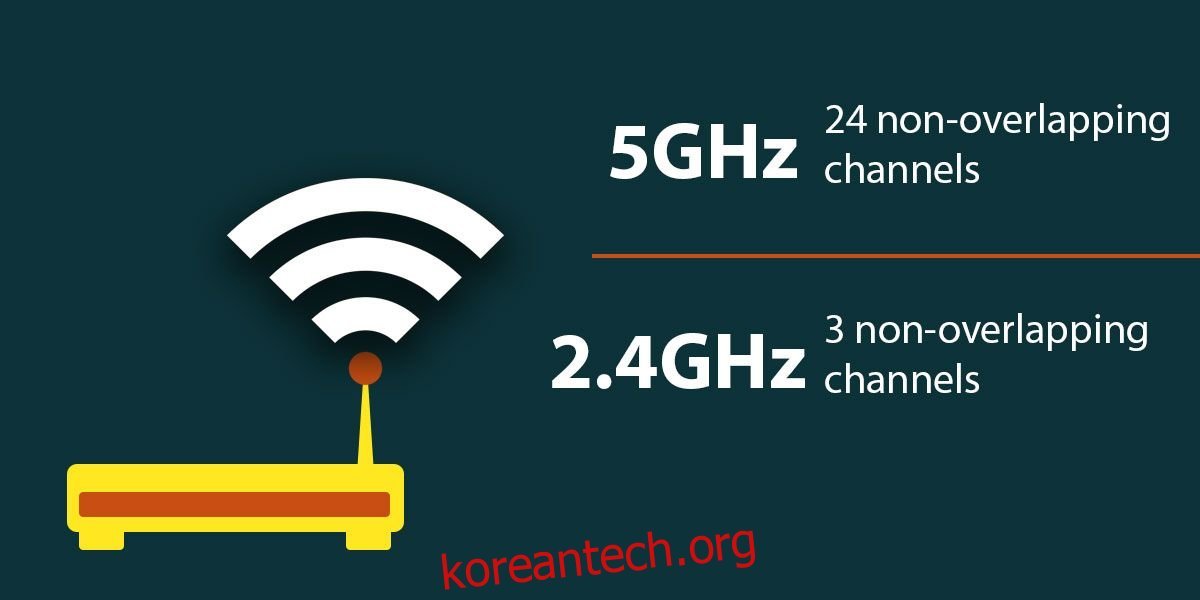 대부분의 라우터는 802.11 프로토콜을 따르므로, 2.4GHz와 5GHz 주파수가 사용자들에게 가장 중요합니다. 2.4GHz 주파수 대역에는 약 14개의 채널이 존재합니다. 이 14개 채널 중 1번, 6번, 11번 채널만이 서로 중첩되지 않는 채널입니다. 5GHz 주파수 대역에는 24개의 서로 중첩되지 않는 채널이 있지만, 이 주파수는 물리적인 물체의 영향을 많이 받으며, 집 안의 식물과 같은 평범한 물건으로도 방해를 받을 수 있습니다.