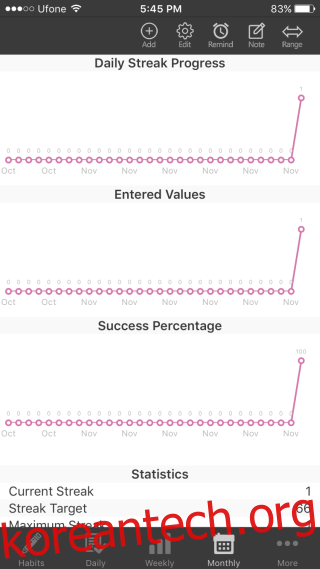 HabitBull은 사용자의 진행 상황을 보여주는 자세한 통계 기능도 제공합니다. 사용자는 주간 또는 월간 연속 기록을 확인하여 어떤 날이 좋았고 어떤 날이 부진했는지 파악할 수 있습니다. 또한 특정 습관을 형성하는 데 필요한 시간(일반적으로 약 66일)을 기준으로 알림이나 목표를 설정할 수도 있습니다. 이 기간은 사용자가 원하는 대로 조정할 수 있습니다.