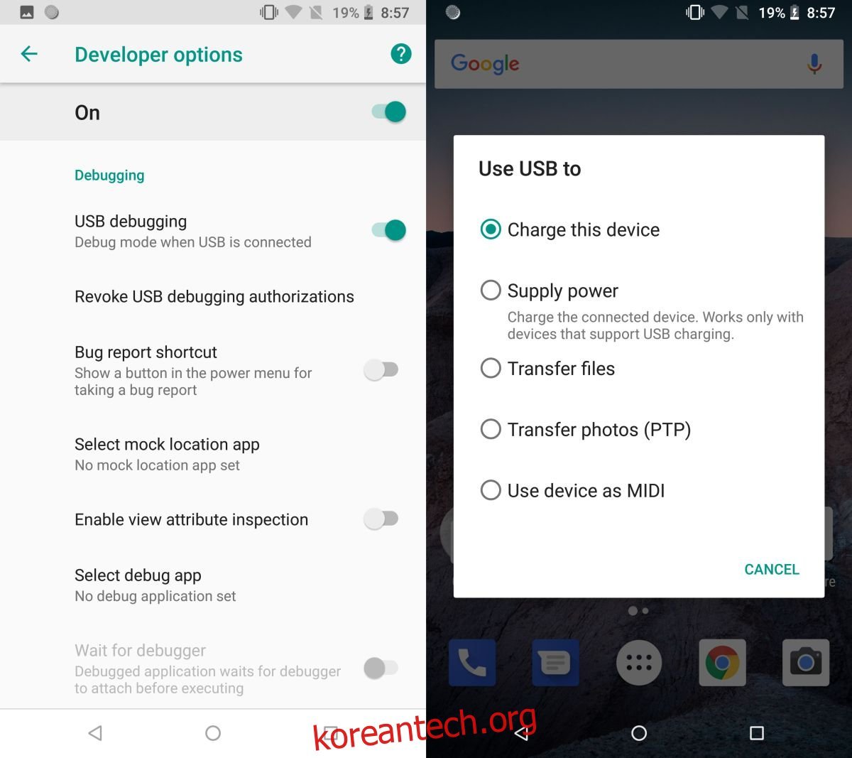 다시 기기의 “개발자 옵션” 메뉴로 돌아가 “USB 디버깅”을 활성화합니다. 그리고 기기를 컴퓨터에 연결합니다.