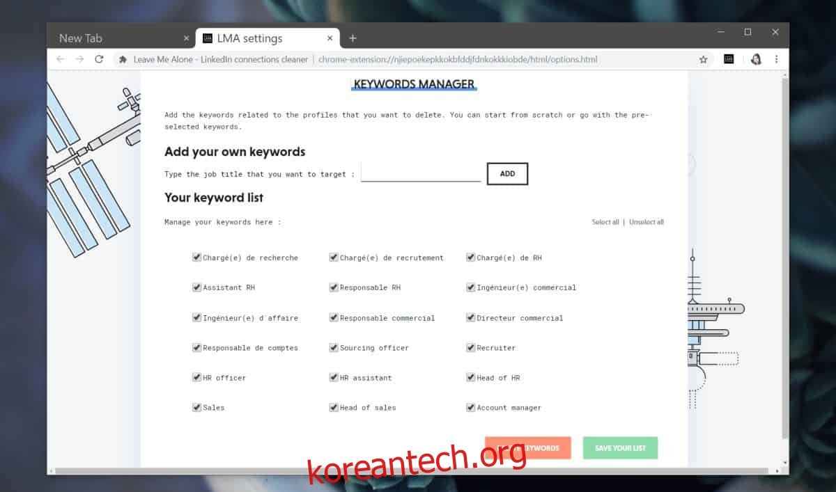 톱니바퀴 버튼을 누르면 확장 프로그램이 연결 및 요청을 필터링하고 삭제하는 데 사용될 키워드 목록을 설정하는 페이지로 이동합니다. 여기에서 특정 단어가 포함된 프로필을 제거할 수 있으며, 필요에 따라 제외할 단어를 추가할 수도 있습니다. 사용자가 설정한 키워드를 기반으로 링크드인 연결 및 요청을 관리하게 됩니다.
