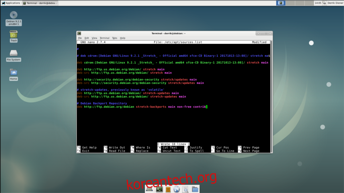 편집기에서 파일 맨 아래로 이동하여 “#” 기호를 추가하고, 주석(예: “Debian Backports Repository”)을 입력합니다. 그 다음 줄에 백포트 저장소 자체를 추가합니다.