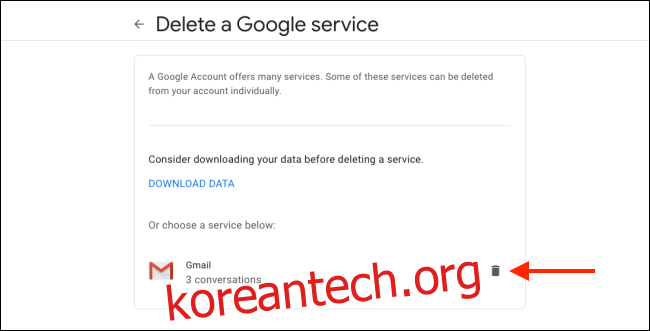 “Google 서비스 삭제” 페이지에서 Gmail 레이블 옆에 있는 삭제 아이콘을 클릭합니다.
