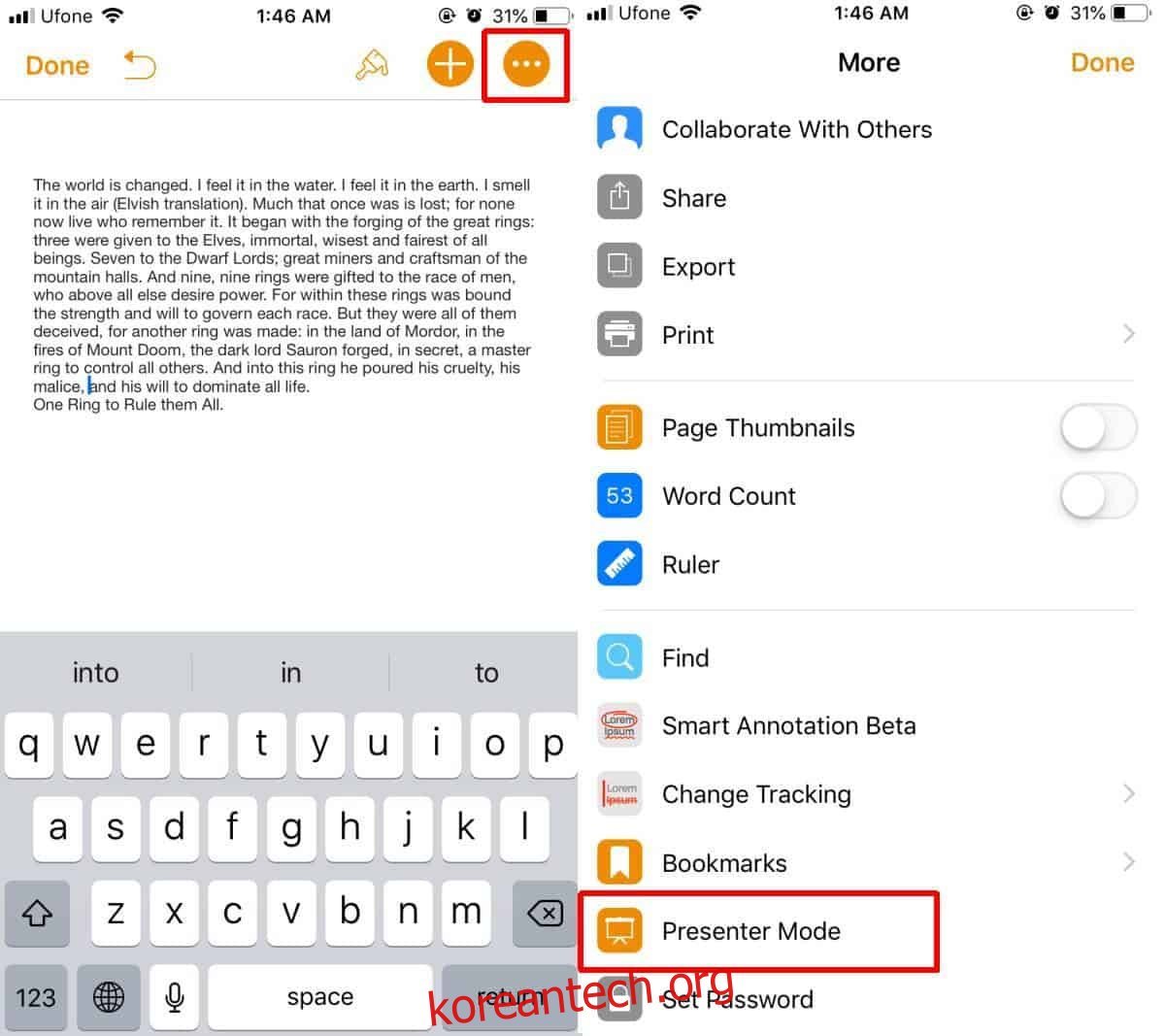 문서는 자동으로 스크롤됩니다. 스크롤을 시작하거나 멈추려면 화면을 탭하기만 하면 됩니다. 만약 프레젠테이션을 준비해야 할 때, 이 기능은 언제든 프레젠테이션을 연습할 수 있는 매우 편리한 방법이 됩니다. 특히 휴대폰을 이용한다면, 실제 프레젠테이션 중에 내용을 놓치거나 중요한 부분을 잊어버리지 않도록 도와주는 유용한 도구가 될 수 있습니다.
