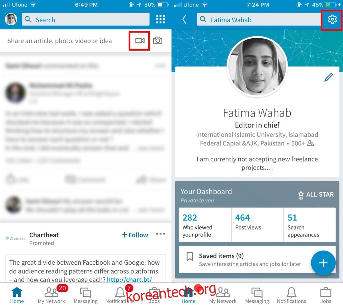 스마트폰에서 링크드인 앱을 실행합니다. 화면 상단의 프로필 사진을 탭하여 설정 메뉴로 진입합니다.