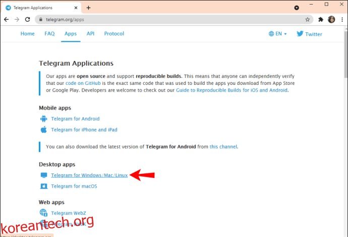 - 데스크톱 앱 섹션에서 “Telegram for Windows/Linux”를 선택합니다.