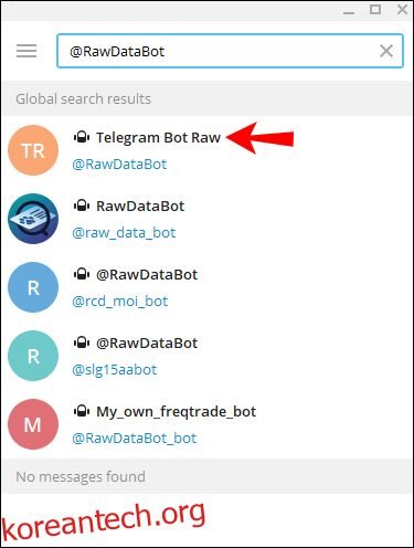 - 화면 왼쪽 상단 구석에 위치한 검색창에 커서를 놓고 “@RawDataBot”을 입력한 후 “Enter” 키를 누릅니다.