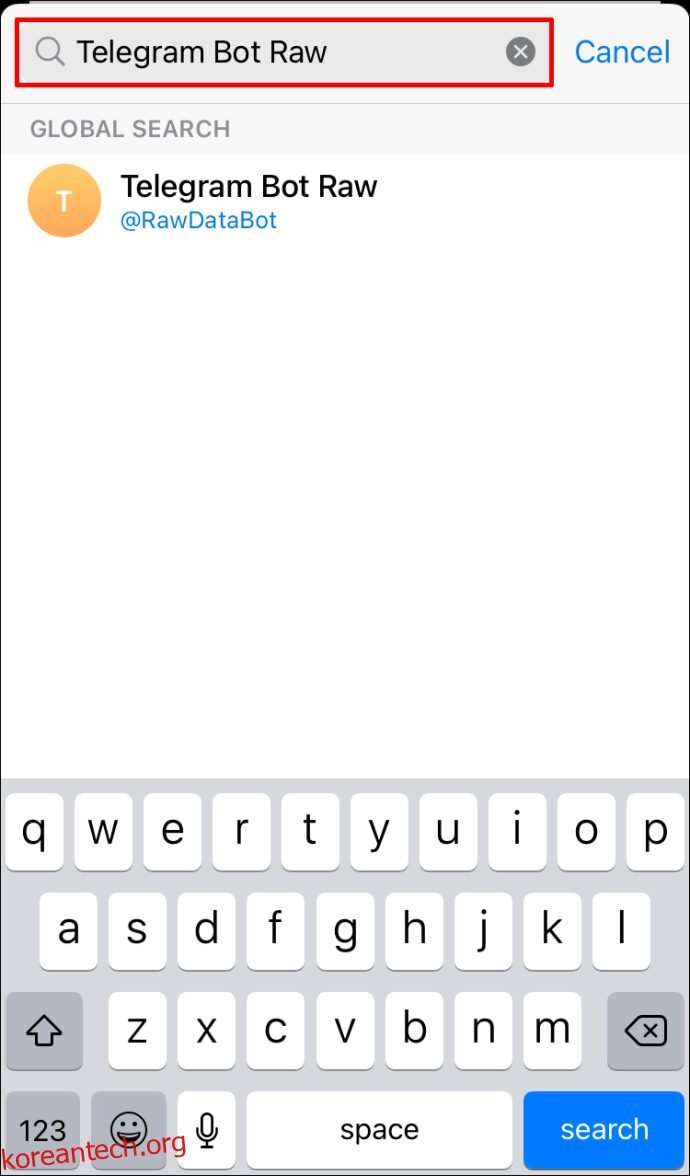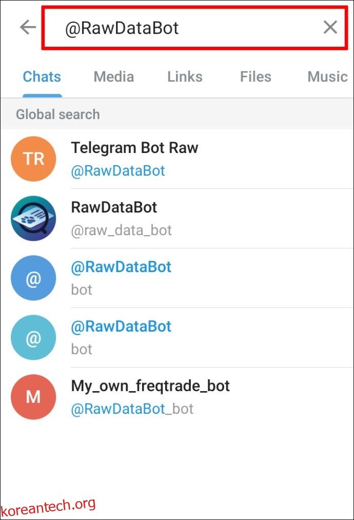 - 검색창에 “@RawDataBot”을 입력한 다음 검색 아이콘을 탭합니다.