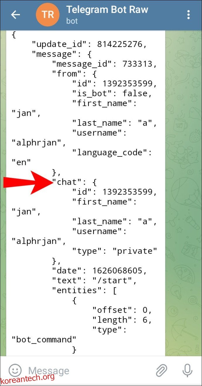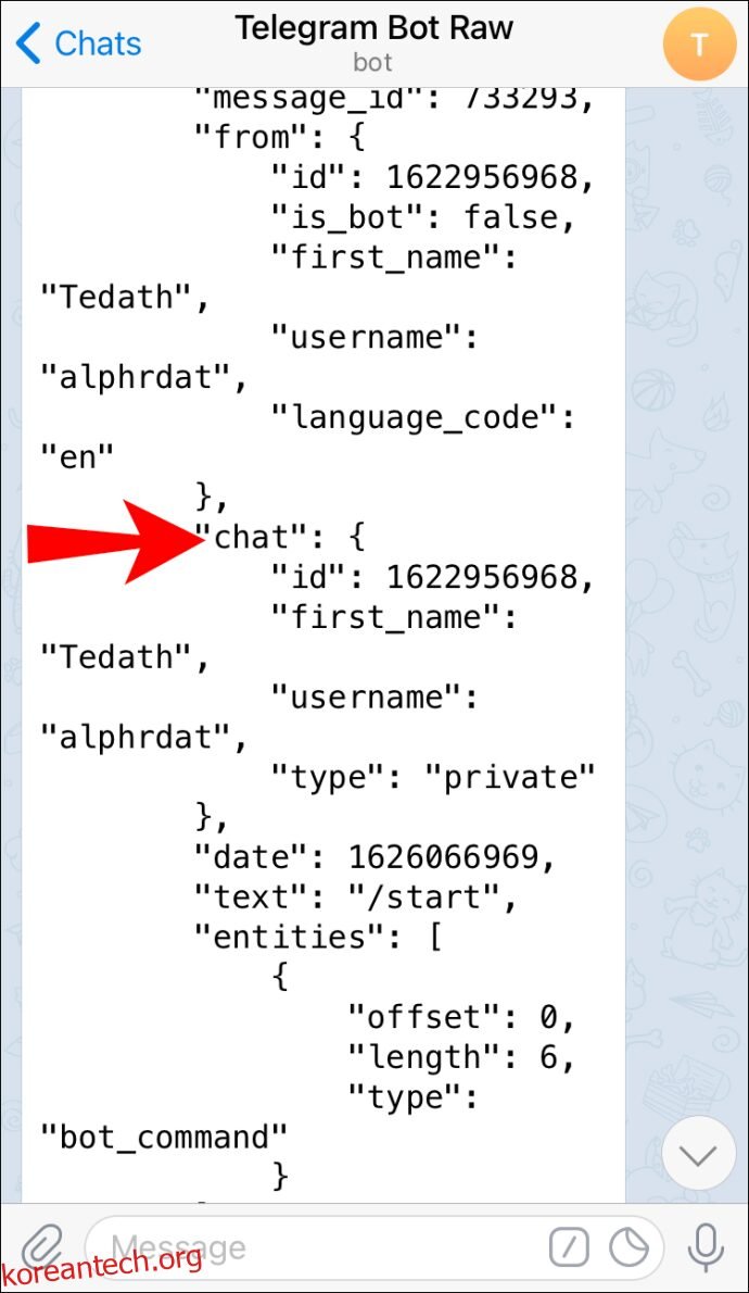 - 이름, 성 및 채팅 ID가 포함된 다른 메시지를 받게 됩니다. 정보 목록에서 “채팅”을 찾습니다.