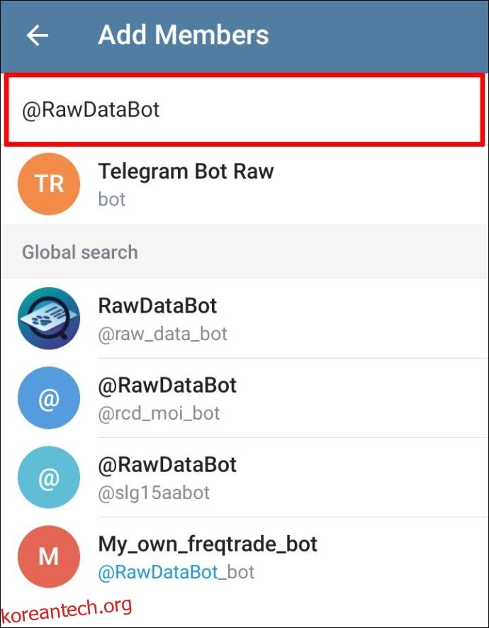 - “@RawDataBot”을 입력하고 드롭다운 목록에서 “Telegram Bot Raw”를 선택합니다.