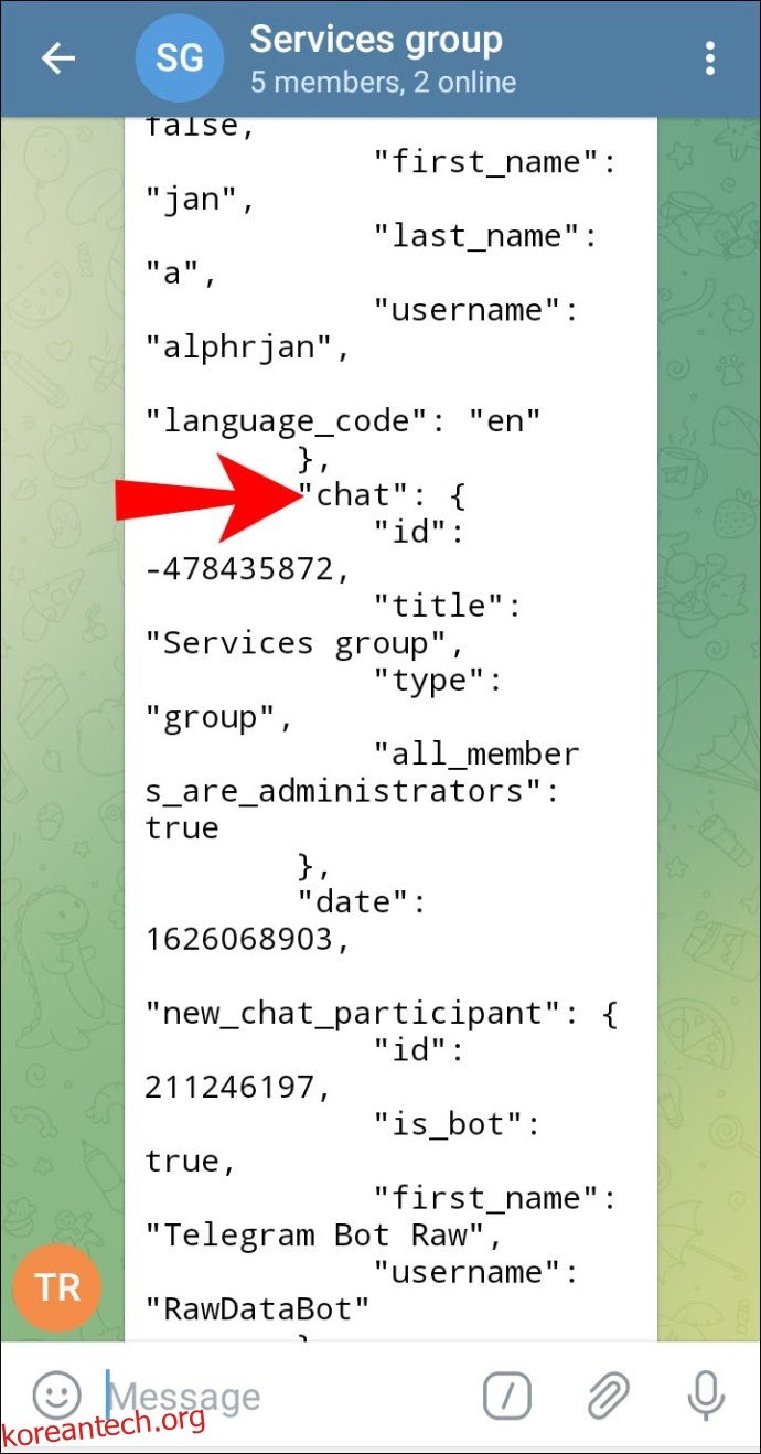 - 채팅으로 돌아가려면 화면 상단의 왼쪽 화살표를 탭합니다. 그룹 정보가 담긴 Telegram Raw Bot의 메시지를 볼 수 있습니다.