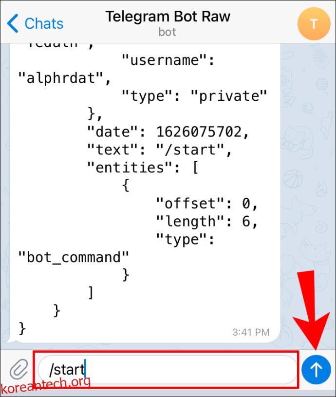 - “/start”를 입력하고 오른쪽에 있는 화살표 아이콘을 탭하여 전송합니다.
