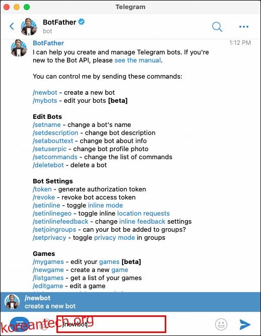 - 명령어 목록이 포함된 메시지가 나타납니다. “/newbot”을 선택하여 봇을 만듭니다.