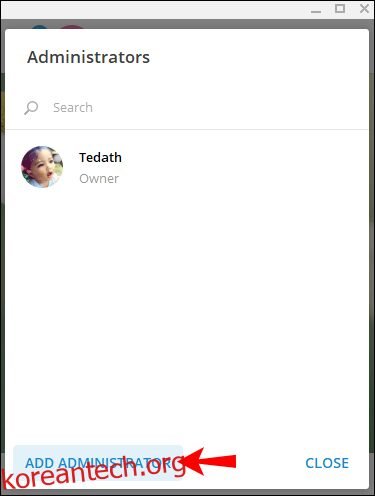 - 왼쪽 하단 모서리에 있는 “관리자 추가” 버튼을 클릭합니다. 구성원 목록에서 봇을 선택합니다.