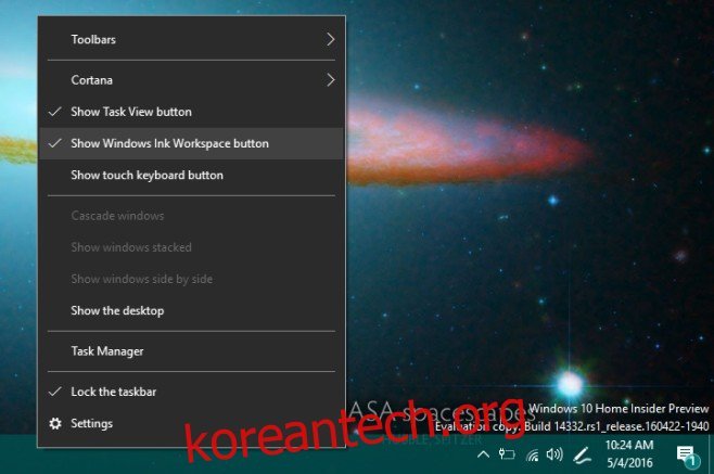 먼저, Windows 잉크 작업 영역 버튼을 활성화해야 합니다. 작업 표시줄을 마우스 오른쪽 버튼으로 클릭한 후 나타나는 메뉴에서 ‘Windows 잉크 작업 영역 단추 표시’ 옵션을 선택하면 됩니다.