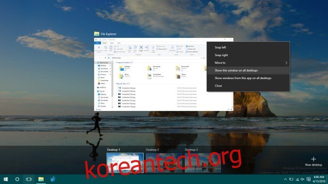 윈도우 10의 가상 데스크톱 기능은 운영체제의 핵심 기능 중 하나이지만, 경쟁자들을 압도적으로 앞서 나가지는 못하고 있습니다. 기본적인 기능 구현에 가깝다고 볼 수 있습니다. 하지만 윈도우는 개발자들이 지속적으로 기능을 개선하고 보완하여 더욱 강력하게 만들 가능성이 높습니다. 마이크로소프트 역시 이 기능을 완전히 마무리하지 않았으며, 올여름 출시될 예정인 기념일 업데이트에서 가상 데스크톱 기능이 일부 향상될 것으로 예상됩니다. 특히, 빌드 14316에서 테스트 중인 새로운 기능 중 하나는 특정 앱 창을 모든 가상 데스크톱에 고정할 수 있는 기능입니다. 작동 방식은 다음과 같습니다.