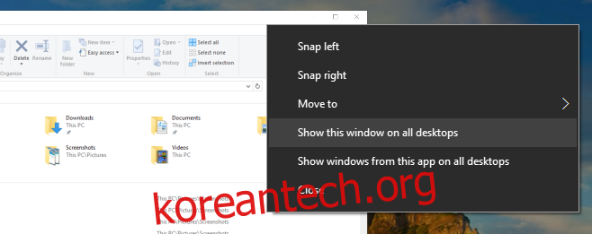 앱 창을 여러 데스크톱에 고정하려면 우선 가상 데스크톱이 두 개 이상 생성되어 있어야 합니다. 작업 보기 버튼(Cortana 옆에 위치)을 클릭하여 작업 보기로 이동하거나, Windows 키와 Tab 키를 동시에 눌러 작업 보기로 진입합니다. 여기서 열려 있는 모든 창과 생성한 가상 데스크톱 목록이 표시됩니다. 모든 데스크톱에 표시하고자 하는 특정 창을 마우스 오른쪽 버튼으로 클릭한 다음, 나타나는 메뉴에서 ‘모든 데스크톱에 이 창 표시’ 옵션을 선택합니다.
