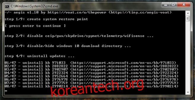 Aegis를 실행하려면 해당 시스템에 대한 관리자 권한이 필요합니다. 이 스크립트는 윈도우 7, 8, 10에서 원격 측정 및 WiFi 감지 기능을 비활성화하고, 윈도우 7 및 8에서 윈도우 10 강제 업그레이드를 유도하는 업데이트를 제거 및 차단하며, 자동 업데이트를 중지시키는 기능을 제공합니다. 스크립트 실행 후에는 사용자가 원하는 대로 업데이트 설정을 변경할 수 있습니다. 제거되는 업데이트 목록은 여기에서 확인 가능하며, 페이지 하단의 Windows 업데이트 섹션에서 자세한 정보를 얻을 수 있습니다.